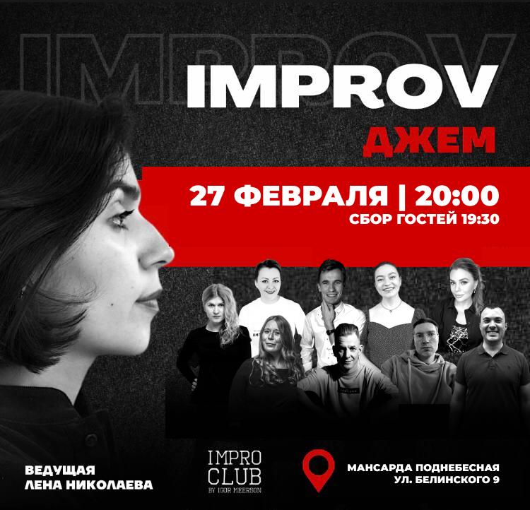 Члены Импро Клуба собираются на одной сцене, чтобы порадовать вас и самих себя комедийным шоу в формате чистой Импровизации. Ни сценария, ни режиссера, только ведущая Лена Николаева и вы, ваши задания, ваши эмоции, ваш смех!