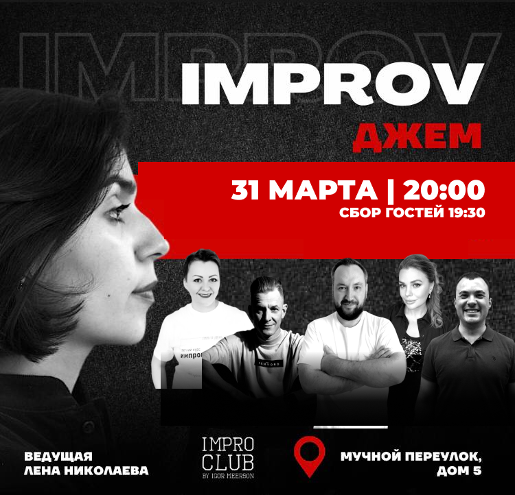 Члены Импро Клуба собираются на одной сцене, чтобы порадовать вас и самих себя комедийным шоу в формате чистой Импровизации. Ни сценария, ни режиссера, только ведущая Лена Николаева и вы, ваши задания, ваши эмоции, ваш смех!