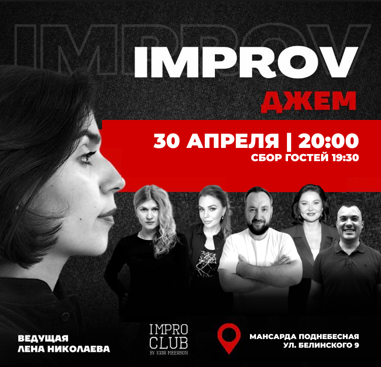 Члены Импро Клуба собираются на одной сцене, чтобы порадовать вас и самих себя комедийным шоу в формате чистой Импровизации. Ни сценария, ни режиссера, только ведущая Лена Николаева и вы, ваши задания, ваши эмоции, ваш смех!