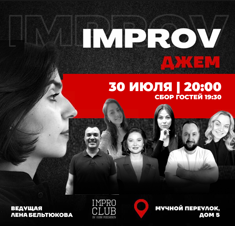 Члены Импро Клуба собираются на одной сцене, чтобы порадовать вас и самих себя комедийным шоу в формате чистой Импровизации. Ни сценария, ни режиссёра, только ведущая Лена Николаева и вы, ваши задания, ваши эмоции, ваш смех!